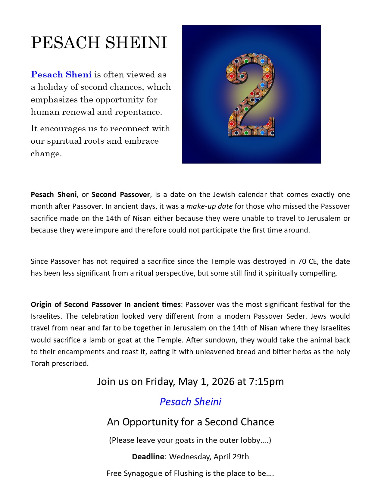 Registration Link: https://freesynagogue.shulcloud.com/event/Pesach-Sheini