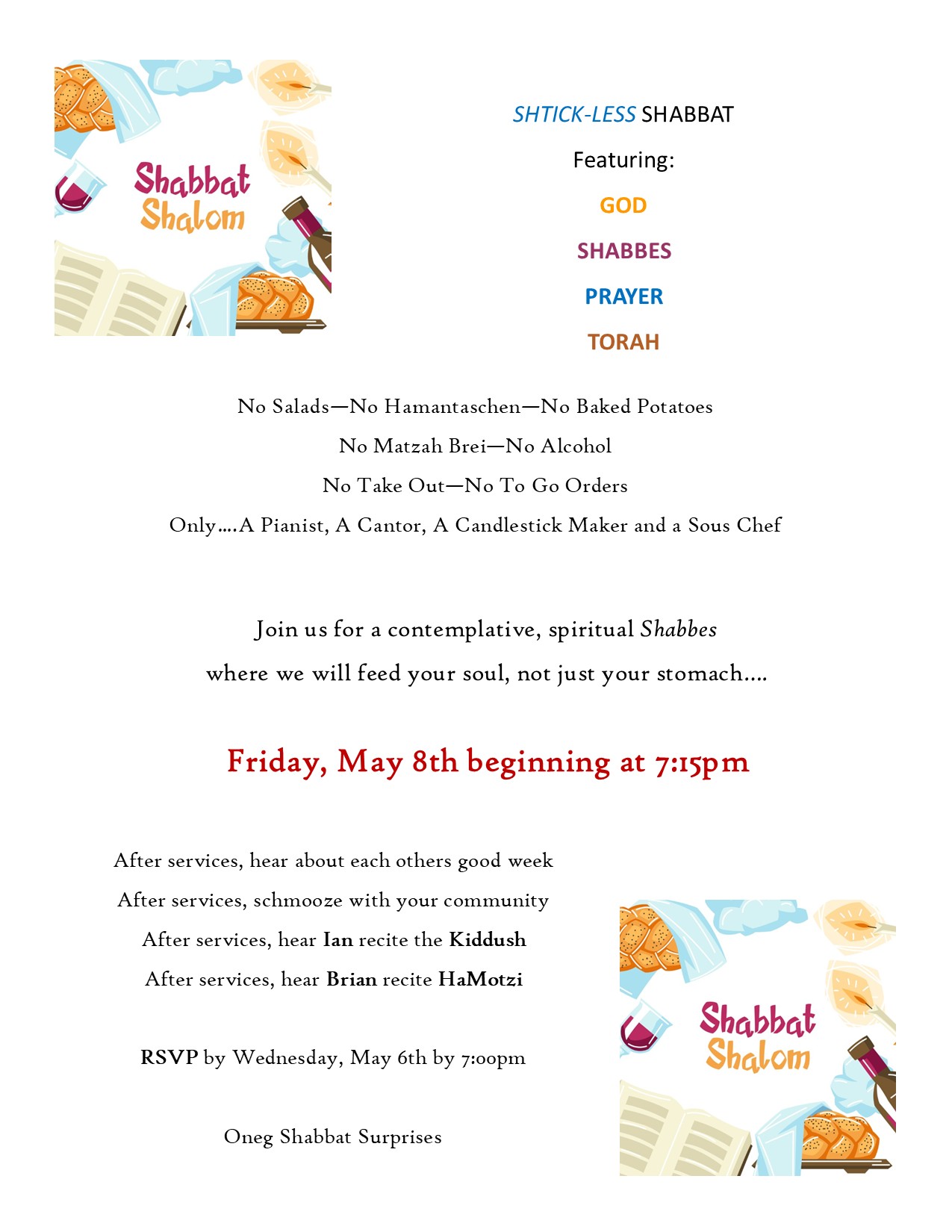 Registration Link: https://freesynagogue.shulcloud.com/event/Shtick-less-Shabbat-May-8th